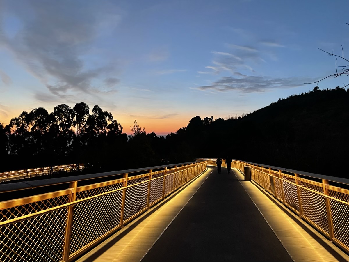 이 압도적인 풍경에 취해 저는 순간적인 '판단 착오'를 범하고 말았습니다. 이번엔 스쿠터 없이 올라왔었기 때문에 도보로 내려가야 했는데, 원래 계획했던 안전한 가로등 길(Blue Route) 대신, 화려한 LED 조명이 반짝이는 낯선 데크길이 눈에 들어왔기 때문입니다.