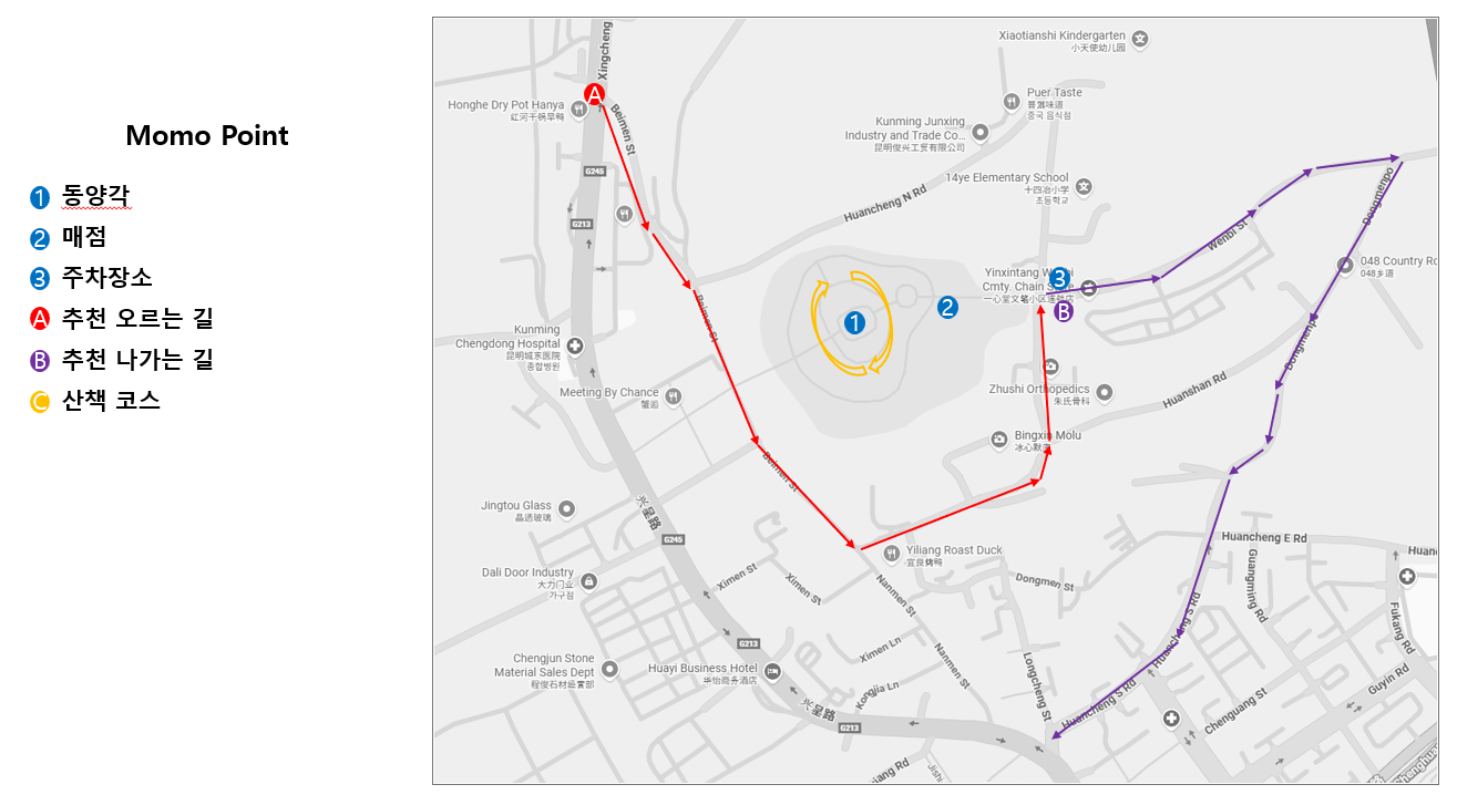 - 진입: 큰길인 '싱청루(兴呈路)'에서 동양각 방향으로 오르막길을 따라 진입합니다.
